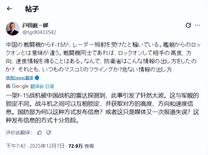 就连日本的退役军官也站出来表达不同看法,一位曾任那霸基地高层的前自卫队军官,在社交媒体上指出,雷达照射在空中对峙中并不少见,不应被简单等同为攻击行为。